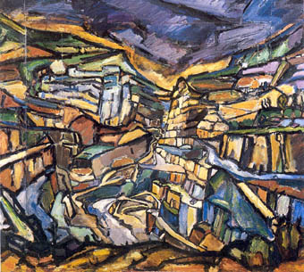 It is a matter of a definition of aim. 'There are enough pretty portraits', he says, with no small amount of scorn. Or landscapes, for that matter. So he deliberately refuses to begin a painting with certain pre-conceived effects, there is no selected composition, no finished picture in view. It is much more a matter of infinite exploration, like a man striding round a mountain. And, before he starts, he does not know how or even if he will finish. 'I try to work to a logical process. But I can't, I'm affected by the weather, how I feel. Chance, accident always plays a part.' At an initial glance, a composition may seem awkward. Why is he showing all those backs of houses or why does that great lump of hill bulge up one side? But, after a while the awkwardness is seen as honesty. The composition is unpredictable, vital, introduces a dimension beyond the confinement of the frame.