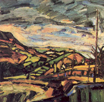And here his problem has been to increase the complexity of the movement without losing the flow. Again it is struggle between head and heart. At times, his views of Bethesda become incredibly intricate yet almost fall apart into squares of houses between patches of green and blue. At others the composition almost melts away into a passionate welter of colour, as in Trees. Sometimes the structure, sometimes the flow is dominant as Prendergast develops the force of his images.