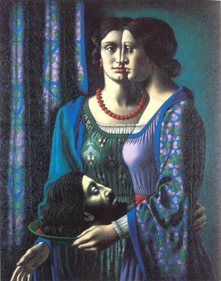 The picture is a masterpiece of artistic organisation. Everything combines to effect a totality of impression. The faces of the mother and the daughter join, interlock ingeniously, suggesting the conspiring together of the forces of evil. Yet it is not simply the faces that meet in evil collusion but also the bosoms and the waists, the hair and the necklines. Echoes reverberate in sinister fashion throughout the picture. The sightless eyeballs of John the Baptist appear to be directed upwards to Salome's face whose gaze is averted. The splash of red on the dish, suggesting the blood shed in the decapitation, is echoed in Salome's waistband, the earrings and the lips of the mother and the daughter, and the line of the mother's necklace - the last to remind us of how John was put to death. But the head, the head - it all comes back to the head of the murdered man. A close examination of the picture reveals the artist's intricate, meticulous treatment of the tragic theme. In the mathematical precision of the painting of the clothes and curtains is represented the detailed, repeated pattern of the severed head. The tiny outlined profile of John's head even appears on the point on Herodias's breast where her nipple would be, the symbol of maternity become a weapon of murderous revenge. What images Janes might have created with Lady Macbeth!