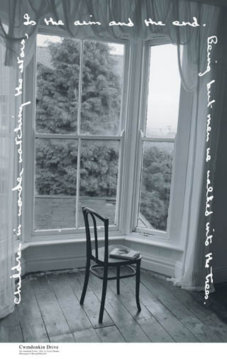 Cwmdonkin Drive, is the first in a series of six images, to mark the 50th anniversary of the death of Dylan Thomas. This limited edition photograph, taken in his bedroom, in Cwmdonkin Drive, where he lived and wrote the words, which surround the image. The photograph is printed digitally on A3 archival paper, signed and numbered, and costs £45 inc post and packing.