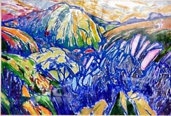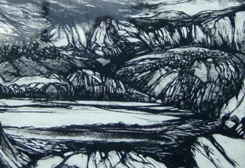 I have run and walked all the surrounding hills and though my paintings, prints and drawings are rarely specific to one recognisable place, they endeavour to express certain essential dramatic qualities of the Eryri environment. Whilst I may occasionally draw and paint before the subject, most often I work from a response to the activity or the visual experience of the day.