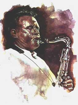 He particularly enjoys painting portraits and has perfected a technique of painting on top of ink washes, as seen in the image to the right. A tonal image is built up using increasingly darker washes, with corresponding tones masked off, from highlights through to shadows. The masking fluid is then washed away and the detail is painted with gouache or acrylics. This leads to many 'happy accidents' reminiscent of watercolour painting, it also gives the paintings a movement and vitality that adds to the overall effect of the work. As you can see, Ian combines his love of painting and music. Musicians are a favourite subject matter and a large range of these images are included within his portfolio.