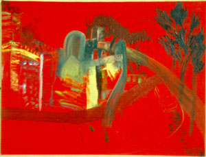 Colour and the mark are crucial to my work. This interest has directly resulted in my obsessions: I take great pleasure in distorting the image in various ways and because of this I have spent many hours on the beaches and in the docks drawing, collecting, and photographing waste materials for my paintings. In London and abroad people are seen ogling at my antics when drawing and photographing reflections in church windows and waterways. The scale of my work is basically very large and the smallest things then become monumental. The photographic image is another obsession of mine and now that I possess a digital camera, the logical development has been the distorted image through the computer.