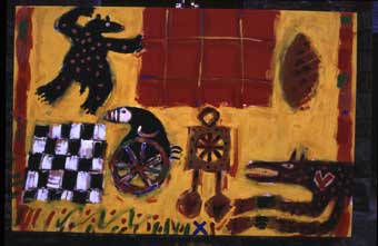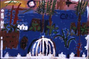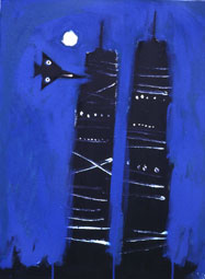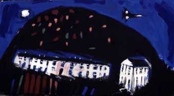 The Intentional naïvety of these paintings is deceptive since these landscapes are as dramatic as any I have seen. Huge dark hills, like hump-backed whales, threaten to devour the straggling ribbons of terraced cottages. Yet these rows of tiny houses, vividly and fiercely painted, seem to have a life of their own. Everything in William Brown's imagery, in spite of initial impressions to the contrary, points to struggle and movement. In 'Harbour and Bay' the buildings and gasometers swirl crazily in a blaze of light. Even the kippers on the table in 'Kipper by Moonlight' fix you with a restless malevolent glare as if suggesting that they may slip away any moment.